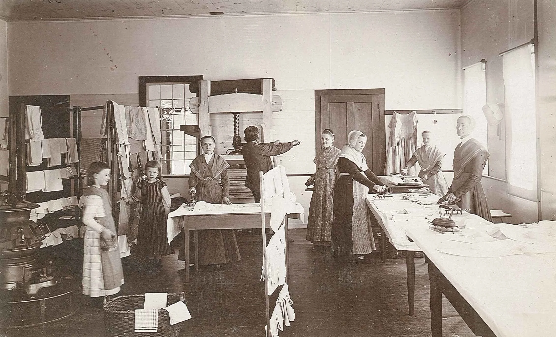 Who doesn’t enjoy sliding between freshly laundered line-dried sheets or wrapping up in a fluffy towel still warm from the dryer? Keeping clothes clean has been part of human life for millennia as have been the traditions that developed around this chore. “Monday we wash, Tuesday we iron, Wednesday we mend,… “ the sentiment if not the exact words of nursery rhymes and hopscotch songs through the ages emphasizes that washing clothes was part of the rhythm of family life. The Shakers, just like their neighbors adhered to this tradition – a tradition that aimed at making sure, even in rainy weather, clothes were clean by the Sabbath. For Shakers, the challenges faced by a neighboring family of seven – toughest stains removed, socks matched, and clothes folded and returned to the right person with missing buttons replaced – increased significantly for their family of seventy.